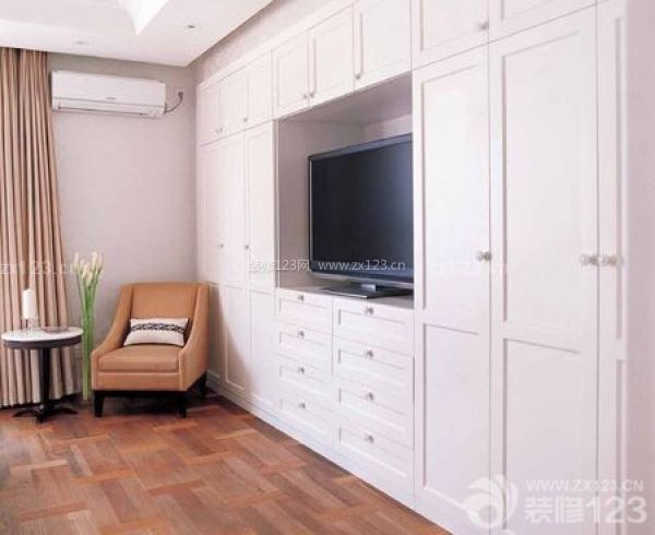 現在很多家庭都有兩臺電視機,第二臺一般都放在臥室,將其懸掛在墻面是最常見的做法,節省空間的同時也填補了墻面的空白。如果臥室空間足夠大的話,懸掛并不是唯一的解決方法。整面墻的柜子可以擁有儲物柜和電視柜的雙重身份,收納衣物的同時也為電視保留了一席之地。臥室空間沒有被隨意揮霍,而是充分利用起來。都說魚和熊掌不能兼得,其實只要經過精心規劃,儲物和娛樂也能做到兩全其美。