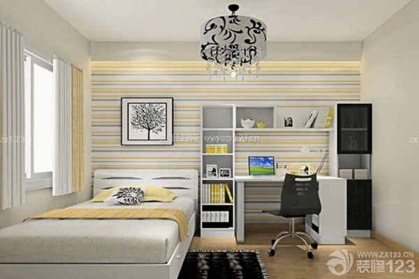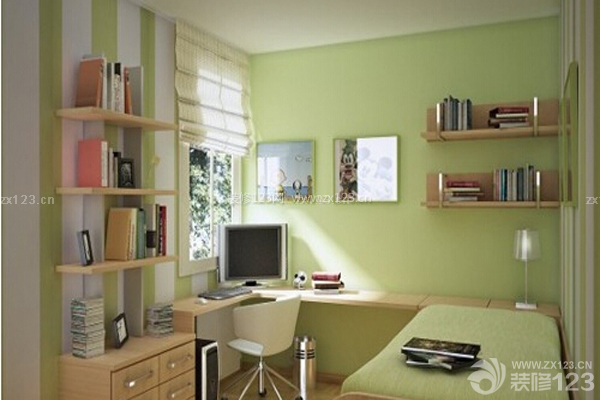 如果家里沒有單獨的書房,將書房設計在臥室內,我認為是最適合不過了,雖說臥室是休息的地方,但是在工作的時候,沒有什么地方能比臥室更安靜了,更舒適的了。這間臥室采用暖色調,墻紙顏色和床、書桌、書柜的顏色相互輝映,合理的利用了臥室的空間,使不大的臥室看起來十分溫暖、舒心,為讀書辦公營造了一個良好的環境。