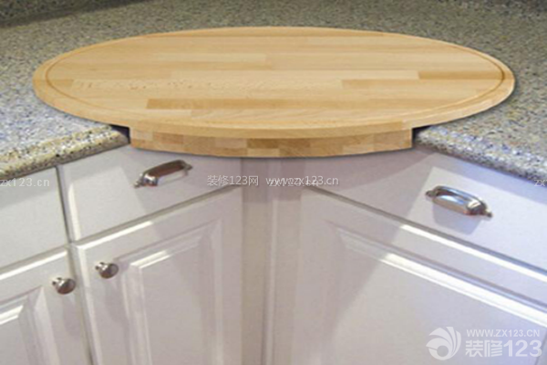 將櫥柜拐角的收納區全盤轉換為操作臺是一個乾坤大挪移式的死角解決法,比如在拐角臺板上配一個,一是可以防撞,二是可以在切菜時利用拐角來穩定砧板。