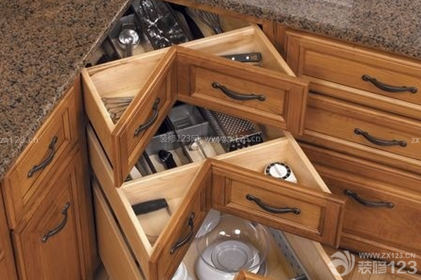 在拐角處安裝M型櫥柜,內(nèi)部可以根據(jù)功能需求設(shè)計隔板,放在最里面的東西,抽屜輕松一拉,就能輕而易舉的取到,真正做到了百分百空間利用率。