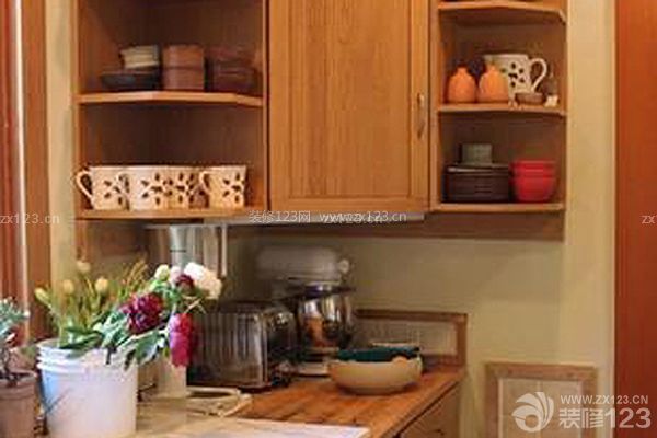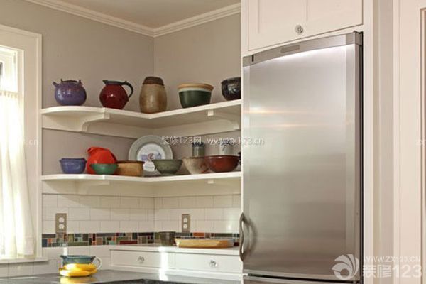 在廚房拐角處安置一個三角形的吊柜,將所有上部空間全部利用起來。