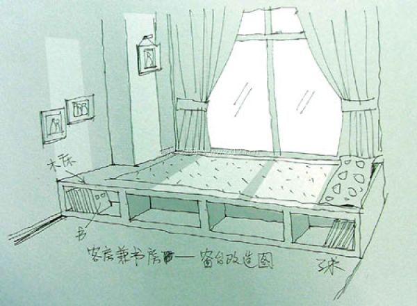 客房的衣柜位置偏小。經過與業主溝通后,決定舍棄傳統的床的概念,將原有的大凸窗延伸進房內,順勢做成一張床。床位改成一個超大的近40厘米高的地臺,地臺下設有4個抽屜,可以放置書刊雜志等零碎物品,上邊只需要鋪上一張床墊即可成為一張舒服的大床了。