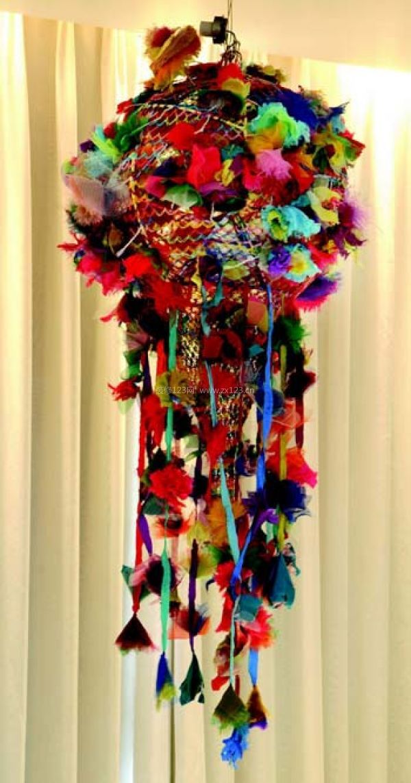 黑色的牛角吊燈有未來主義的特征,追求挺直的幾何造型及光滑的流線形式,同時又簡潔明快,酷酷的感覺是哥特一族的最愛。燈體為紅色的軟塑料材質,均衡地折彎而成,柔和的白色巧克力底座中和了熱烈感,使氛圍轉變為火樹銀花般的甜蜜。白色羽毛通過多層次的連接制造出流蘇般的效果,整體感覺溫馨浪漫,既自然又具有很強的裝飾功能。
