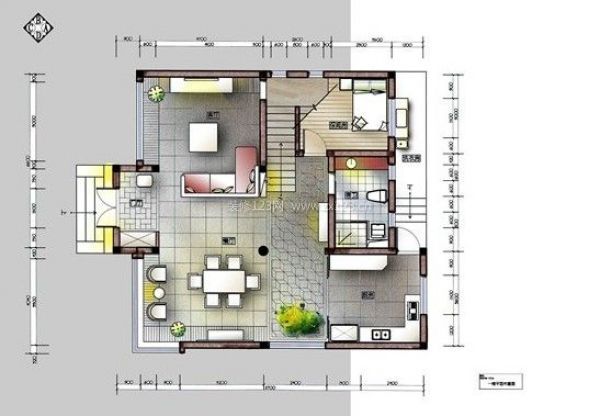 一樓平面圖一樓將原有的車庫加高改為客廳,把原來的入戶門向外推,確保了空間的完整性和寬敞性,將原來面積不大的櫥衛(wèi)空間均面積最大合理化。一層公共空間沒有做刻意的三維區(qū)域分割,只是在地面上按不同使用功能作了不同的拼花處理,顏色采用我個人認(rèn)為較個性、高雅的灰度咖啡調(diào)。