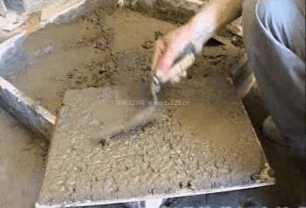 第四步:把沒有飽滿的地方填滿后,再撒上素水泥(純水泥),再次貼上墻,貼平,用橡皮錘敲結實。
