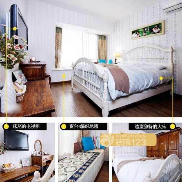 點評:來到了主臥,白色的墻面都被粉飾過。整體基本上都延續了白色搭配深色地板和木制家具的設計。主臥安裝有電視,方便主人躺在床上,舒舒服服地欣賞電視節目。飄窗鋪上了波西米亞風格的地毯,搭配上藍色的靠枕,真的很養眼。