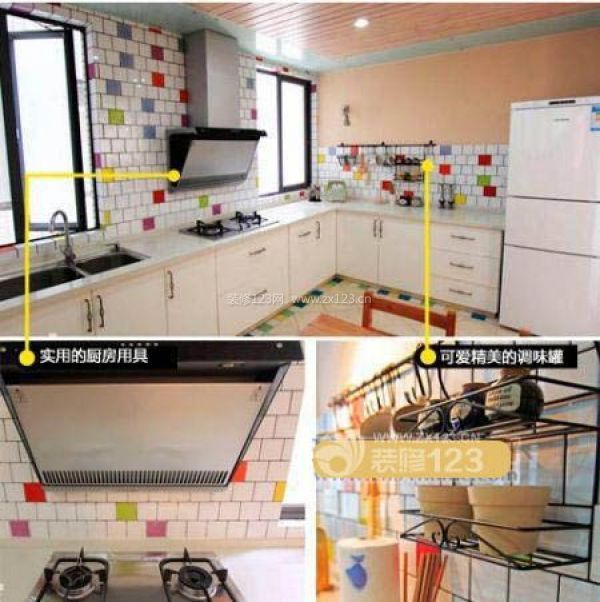 點評:廚房的設計別致可愛,墻磚五顏六色使廚房俏皮鮮活起來,可愛的調味瓶安放在此處是一個很好的裝飾品,廚房用具款式不花俏卻很實用。