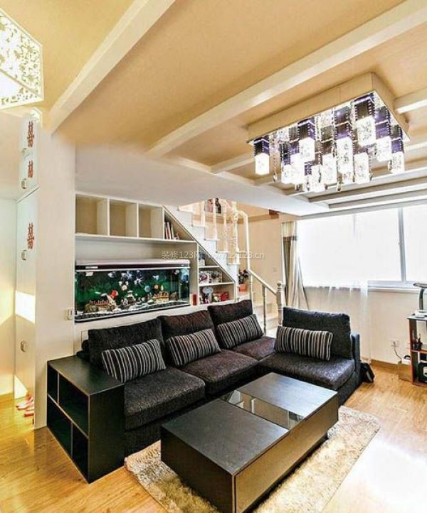 客廳黑色的沙發(fā)和茶幾,樓梯間改造成儲物柜,還擺放了魚缸裝飾。