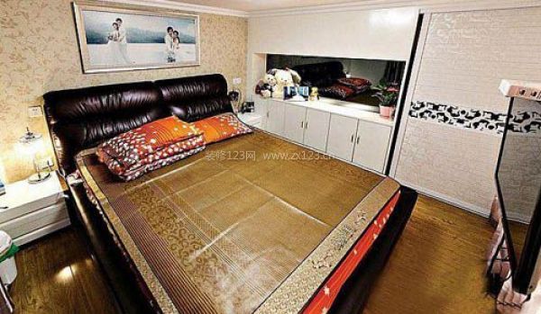 壁紙裝飾的臥室背景墻以及白色的儲物柜。