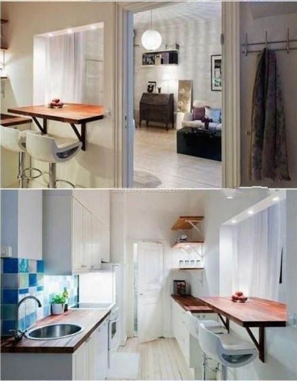 廚房和臥室只有一墻之隔,在他們中間開了個窗口,裝修一個“桌子”,再加上若干高角椅,既時尚又實用,在閑暇的時候坐下來慢慢享受美食帶來的快樂。