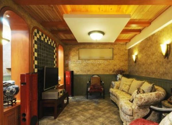 該客廳傳遞出美式風格的氣息,采用暖色調碎花圖案布藝沙發裝扮客廳,為客廳增添了溫馨氛圍,沙發背景墻采用暖色圖案的壁紙裝扮在柔和燈光的照射下,使客廳不僅增添了柔美感,同時也散發出客廳的高貴氣質。
