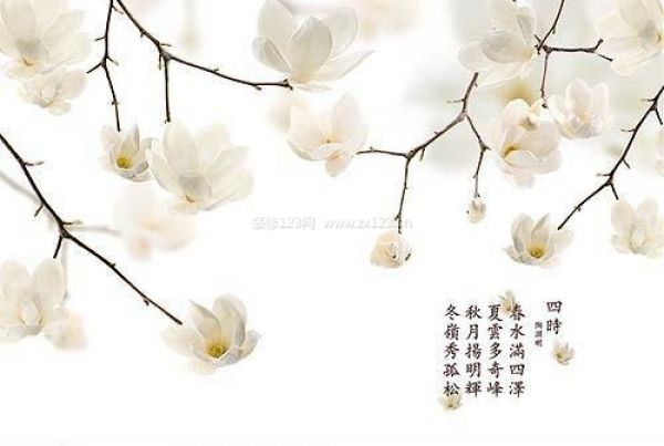 用傲雪凌霜的白梅作為畫面的主要元素,再題上陶淵明的《四時(shí)》詩,讓墻面顯得高雅大氣,充滿詩情畫意。