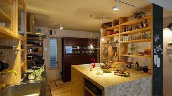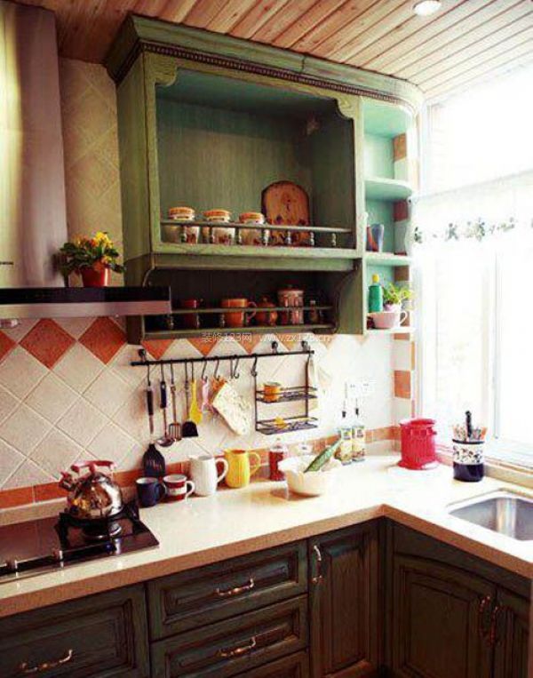 編輯點評:用復(fù)古式小瓷磚砌成的工作臺,面積寬大,可以滿足洗涮、準(zhǔn)備等工作。開放式木架,透露出暖暖的原木色彩,方面收納和拿取。