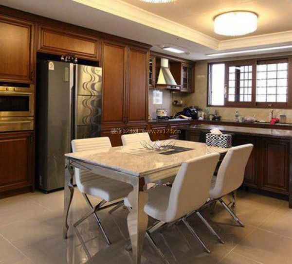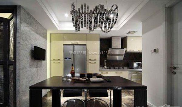 編輯點評:餐廚在同一空間,大理石紋理墻面與同樣紋理的地面連接在一起,讓空間更加開闊。整體式廚房囊括了所有現(xiàn)代化電器,餐廳的吊燈更增加了空間的現(xiàn)代感。