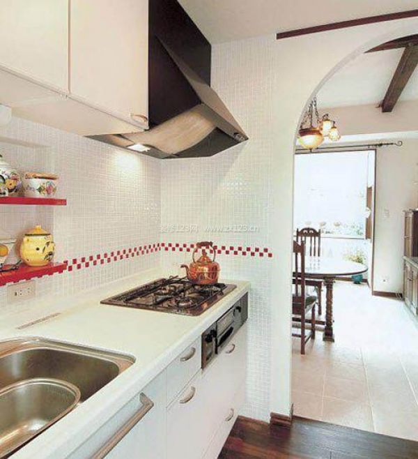 編輯點評:廚房就在飯廳的另一側(cè)。采用明亮的白色做主顏色,墻上貼上紅色的小方磚,簡潔大方而又不顯單調(diào)。