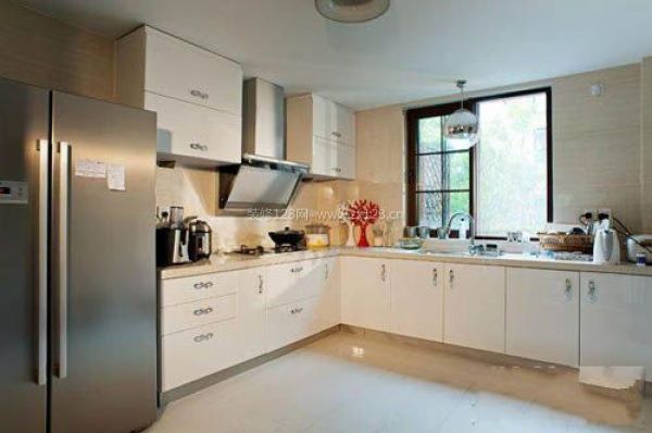 編輯點評:半開放式的廚房用干凈的白色作為主色調(diào)。地面也用了淺色的瓷磚做了大面積的鋪設(shè),和白色的廚具柜門營造出一個和諧的空間。