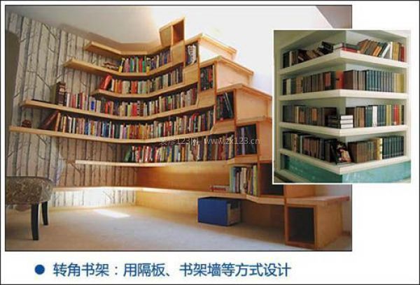 設計技巧:像這種轉(zhuǎn)角墻面設計很有新穎,通過支架隔板的方式改造成帶有儲物空間的墻面,帶有很好的收納空間。用書架做了轉(zhuǎn)角延伸,讓角落的每一個細節(jié)都趨于完美。講求空間的實用性,同時也更注重其美感。