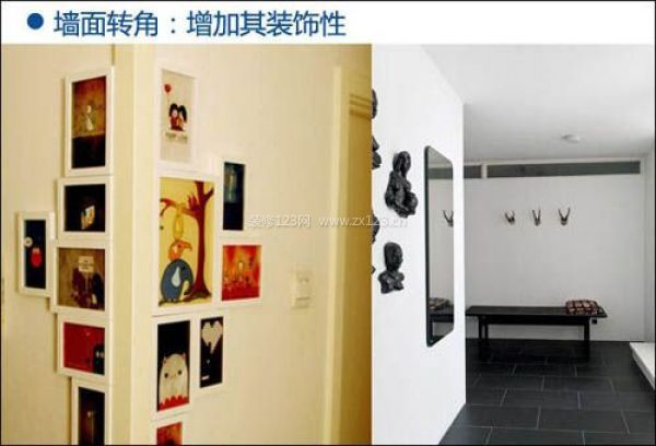 設計技巧:墻面轉(zhuǎn)角利用相片墻的設計形式對其裝飾,通過相框的點綴讓原本黯然失色的墻面帶有與眾不同的活力與新鮮。也可以通過鏡子、雕刻的藝術(shù)畫對其修飾,特別是對小空間而言,它更能在空間上得到一種延生感。
