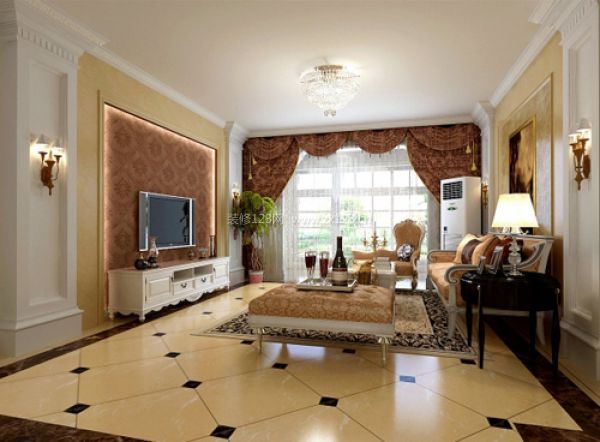 本案例的亮點為客廳的電視背景墻,歐式風(fēng)格的深色壁紙配上兩側(cè)的造型以及壁燈,顯得非常的大氣,而和電視背景墻呼應(yīng)的沙發(fā)背景墻則采用了淺色系的壁紙,這樣一深一淺的搭配很好的體現(xiàn)出了簡歐的風(fēng)格, 地面使用的石材以及小花磚則進一步抬升了整個空間的檔次、品位。
