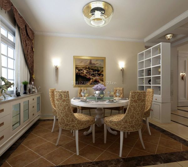 餐廳沒有太多復(fù)雜的裝飾,圓形的餐桌椅是復(fù)合中國風(fēng)水學(xué)上對餐廳家具的要求的,無論是壁燈還是頂燈,都非常好地營造出一個溫馨的就餐環(huán)境。在整個餐廳空間中,最富有歐式風(fēng)格特征的當(dāng)屬華麗的餐椅、壁畫以及窗簾,在窗邊做了收納功能強大的柜子,很多隨手小物都可以“隱藏”起來,使整個空間不至于顯得凌亂,對于歐式裝修風(fēng)格不是很懂的朋友,也可以參考歐式裝修效果圖。