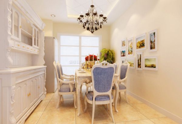 設(shè)計亮點:米白色的餐廳背景墻制造出很多溫馨的氣氛,與純潔的白色相搭配,亮白色的餐桌,歐式座椅,營造出簡約不簡單的視覺效果。同時餐廳背景墻通過框畫的修飾,增強(qiáng)其整體的豐富性,給進(jìn)餐氣氛增加更多情趣。