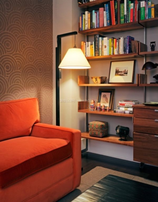 溫馨的書房一角,暖暖的燈光,橘色的沙發在深夜更添一分暖意,收納架上無論是喜歡的書籍還是心愛的裝飾品,都觸手可及。