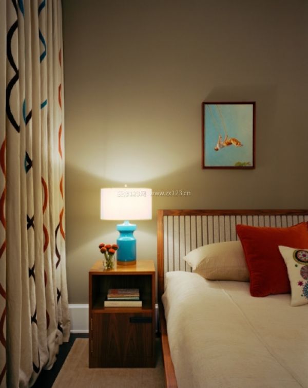 同樣淺色調的臥室,白色的床品,白色系的窗簾,這一切在柔和的床頭燈光籠罩下,溫馨舒適。
