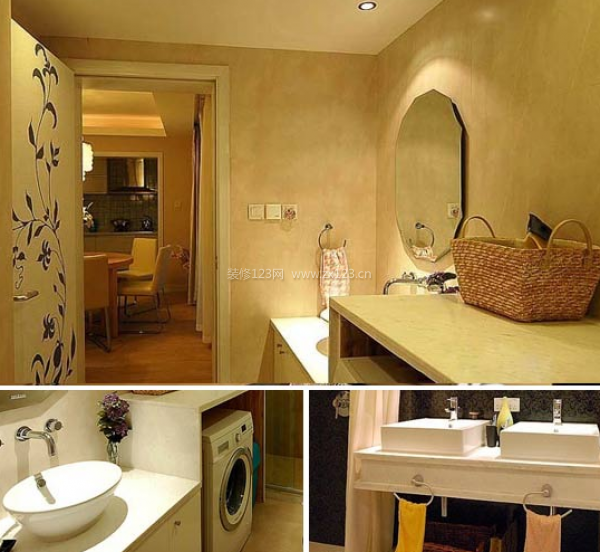 衛(wèi)生間布局在餐廳的隔壁,米白顏色體現(xiàn)衛(wèi)生間的整潔,瓷洗刷盆形狀不一,打破統(tǒng)一的單調(diào)。迷你洗衣機(jī)大,不但外形可愛,而且節(jié)省空間。