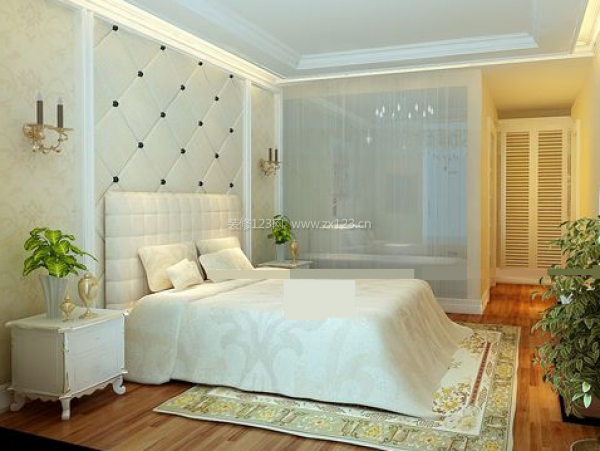 素白的床盡顯高雅和華美,綠色的盆栽為該臥室裝修設計增加了新的生機。