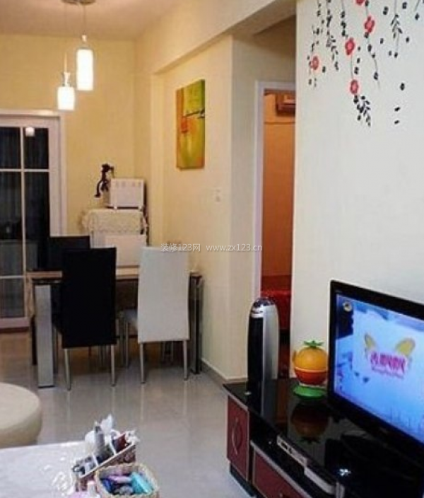 這個(gè)角度可以看見電視背景墻上方的手繪小花,燃空間顯得十分生動(dòng)有活波。餐廳上的吊燈是業(yè)主自己買的。而簡(jiǎn)易的餐桌能夠容納一家人,微小的餐桌不但能保證基本的功用,還拉近一家人的距離。