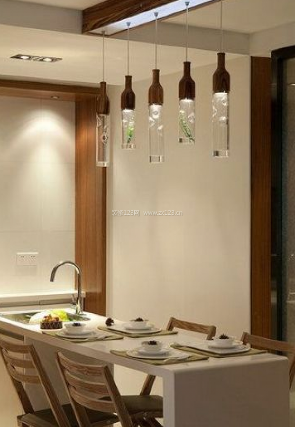 餐廳采用吧臺的設計方式顯得既時尚又浪漫。燈光采用水晶裝,內嵌有綠色植物葉片,讓餐廳空間適當加入了自然情切的感受。讓日式風格和現代簡約風格的混搭不出不在。
