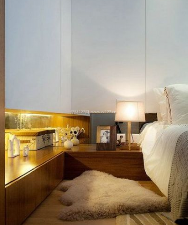 干凈整潔的白色加上原木風味的木材,恰當的將簡潔和日式風格融為一體。床頭邊設計采用一段懸空的壁柜夾層,不但可以收納,還可以擺些裝飾等,在表現出創意的同時,還大大增加了臥室的容物能力。