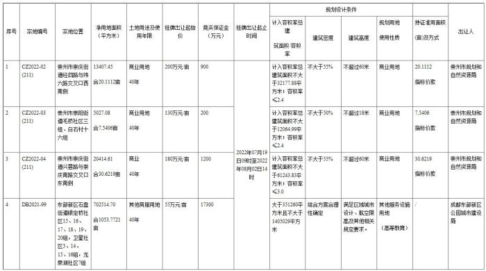 據(jù)出讓公告顯示,有3宗地塊位于崇州市,均為商業(yè)用地。另一宗地塊位于1位于東部新區(qū)位于東部新區(qū)石盤街道銀定橋社區(qū)15、16、17、18、19、20組,衛(wèi)星社區(qū)3、14、15、16組,龍泉湖社區(qū)7組,為高等教育用地,計(jì)容建面大于351260平方米且不大于1405029平方米,出讓起始價55萬元/畝。