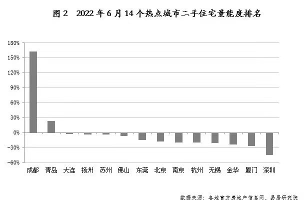 2022年6月,成都以357.3%的月度同比增速、256.5%的1-6月同比增速,在易居全國14個重點監控城市“一騎絕塵”的同時,其二手住宅成交量能度高達162.5%,創下2013年4月以來的最高記錄。