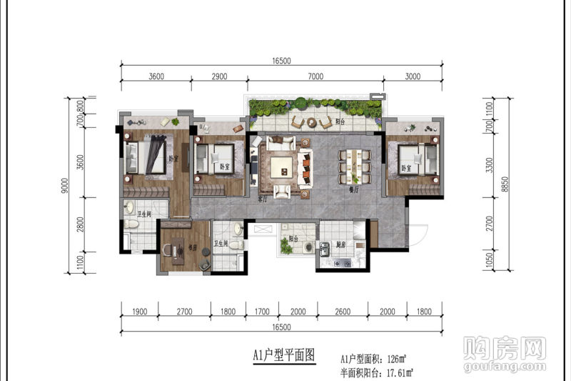 【戶型A1】:4室2廳,朝向為南,建面約126㎡,參考單價約22000/㎡
