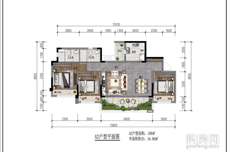 【戶型A2】:3室2廳,朝向為南,建面約108㎡,參考單價約22000/㎡
