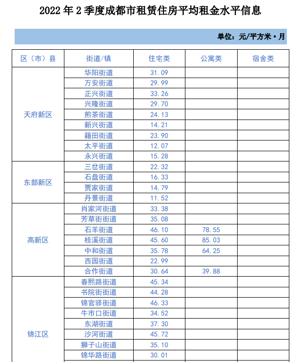 近日,成都住建局按照《成都市租賃住房規劃設計技術導則(試行)》分類標準,發布2022年2季度成都市租賃住房平均租金水平信息。