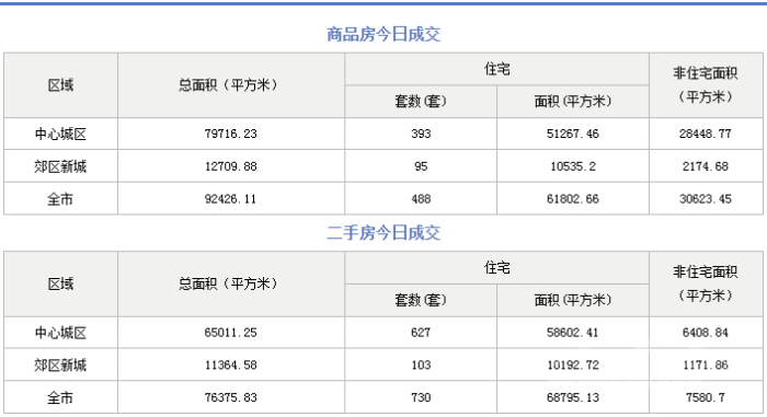 7月28日,成都市住建局住建蓉e辦數據顯示,成都市全市商品房成交(備案)總面積92426.11平方米,其中其中商品住宅成交(備案)488套,商品住宅成交(備案)面積61802.66平方米。二手房成交(備案)總面積76375.63平方米,其中二手住宅成交備案730套,二手住宅成交(備案)面積68795.13平方米。