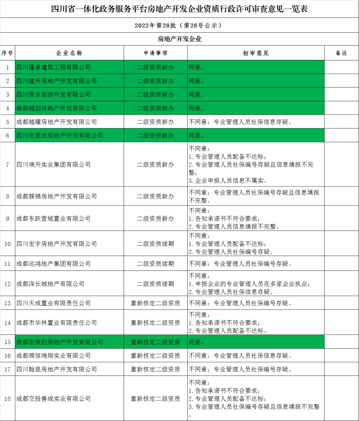 近期,據(jù)成都市住建局官網(wǎng)發(fā)布的《關(guān)于四川省一體化政府服務(wù)平臺房地產(chǎn)開發(fā)企業(yè)資質(zhì)行政許可審查意見的公示(2022年第28號) 》,18家房地產(chǎn)開發(fā)企業(yè)二級資質(zhì)審核的初步意見已出爐,其中僅四川蓬卓建筑工程有限公司、四川建升房地產(chǎn)開發(fā)有限公司、四川原鄉(xiāng)旅游開發(fā)有限公司、成都越創(chuàng)房地產(chǎn)開發(fā)有限公司、四川宏星達(dá)房地產(chǎn)開發(fā)有限公司、成都市美的房地產(chǎn)開發(fā)有限公司六家公司的初審意見已為同意,因其他公司都存在一定問題,目前企業(yè)二級資質(zhì)審核都已被否決。