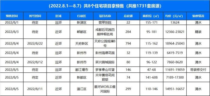 據(jù)有關(guān)數(shù)據(jù)顯示,成都8.18.7共有8個(gè)住宅項(xiàng)目獲取預(yù)售,分別為翡翠別院、成都后花園四期梓桐名苑、天府公園觀瀾8號(hào)、彭州海德花園、辰興錦城國(guó)際、夢(mèng)享春山可望、炎華置信·花間君邸、星河WORLD星河國(guó)際,共計(jì)11731套房源,環(huán)比上漲13%,其中近郊4個(gè)項(xiàng)目共1451套,遠(yuǎn)郊4個(gè)項(xiàng)目共280套。