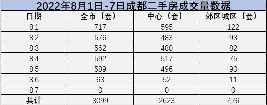 據(jù)數(shù)據(jù)顯示,2022年8月1日7日,成都二手房成交量共計為3099套,中心區(qū)域為2623套,郊區(qū)城區(qū)為476套。
