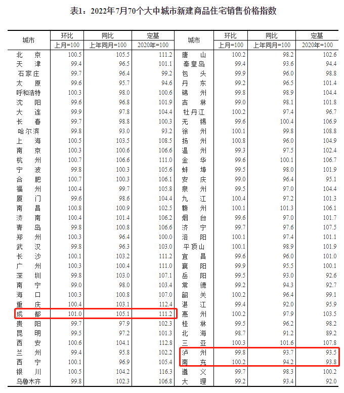 國家統計局發布了2022年7月份70個大中城市商品住宅銷售價格變動情況。
