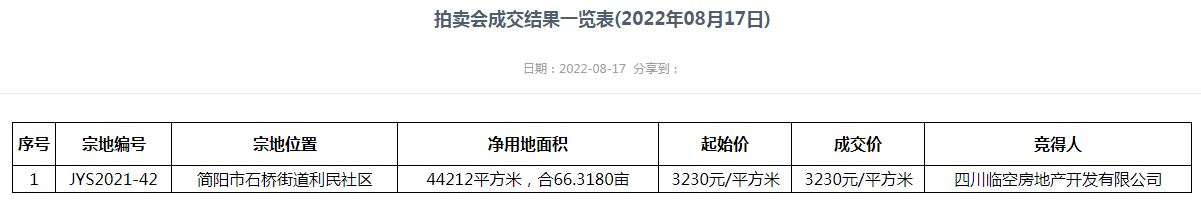 四川簡陽市石橋街道利民社區1宗商住地成功出讓,被四川臨空房地產開發有限公司摘得,成交價約3.57億元,成交樓面價3230元/平方米。