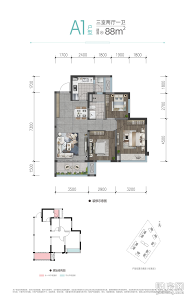 A1戶型(3室2廳,88平,南北)