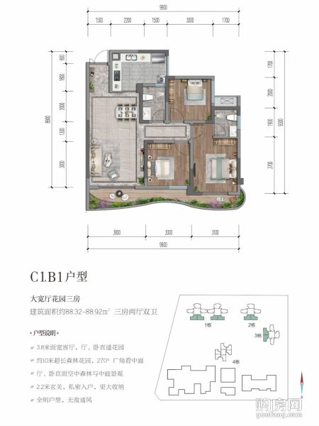 聯想天府云城C區C1B1戶型(3室2廳,88.32平,南)